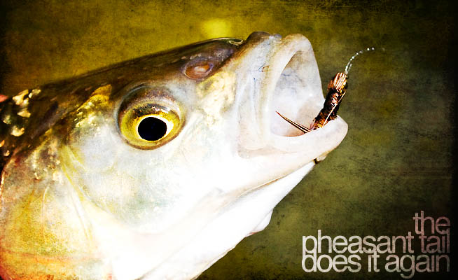 Onlangs waren we naast een weekje aan de Franse kust ook te vinden in het prachtige Ardeche gebergte. Een heel ander deel van Frankrijk met idylische riviertjes en diepe bergkloven, waarbij men zich even waant in prehistorische tijden. Alhoewel de rivieren overdag druk bevolkt worden door fransen die het stromende water gebruiken om afkoeling te zoeken, zijn er gelukkig nog genoeg plekken te vinden waar je rustig met de vliegenlat kunt staan. En ja hoor zoals gewoonlijk deed de beroemde pheasant tail weer zijn werk. Nou ja niet de originele versie, we binden de vlieg met een goudkop zodat ze iets sneller zinkt en daardoor nog gevarieerder ingezet kan worden. Stoomopwaarts met een dead drift en stroomafwaarts langzaam met tikjes terugvissend (nimf), of zigzaggend laten bewegen op volle lengte van de vliegenlijn waarbij je middels het bewegen van de vliegenhengel van links naar rechts zowel de kantjes als het midden van de rivier afvist (bijv. imiteren van speldaas). Vele kopvoorns waren het gevolg en de pheasant tail deed haar werk weer opperbest!