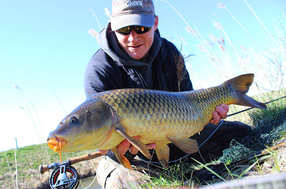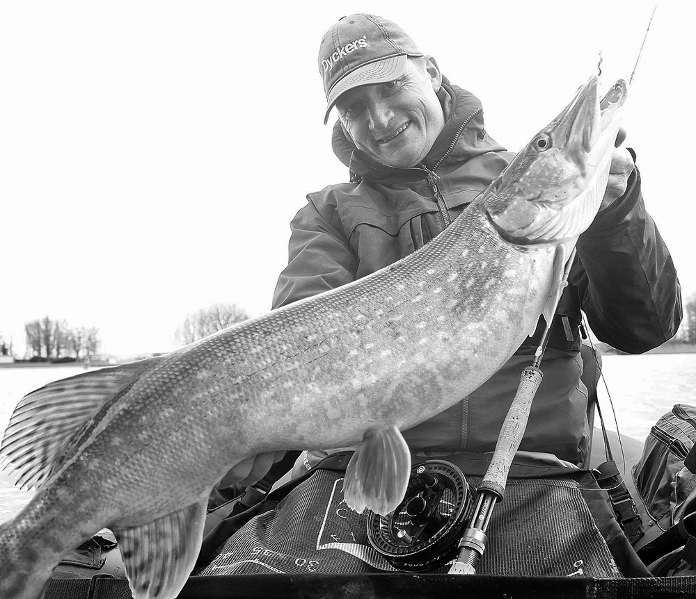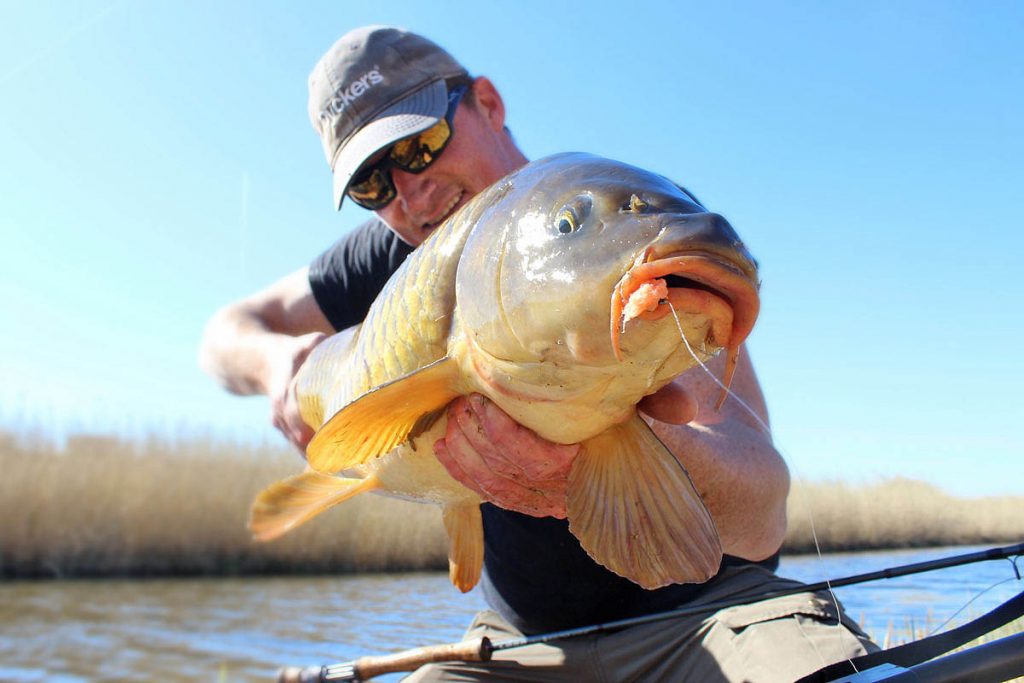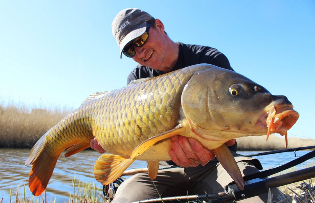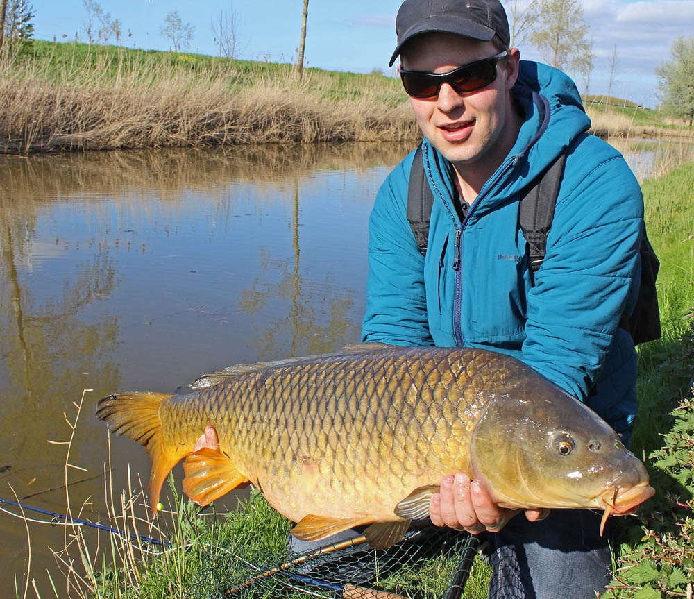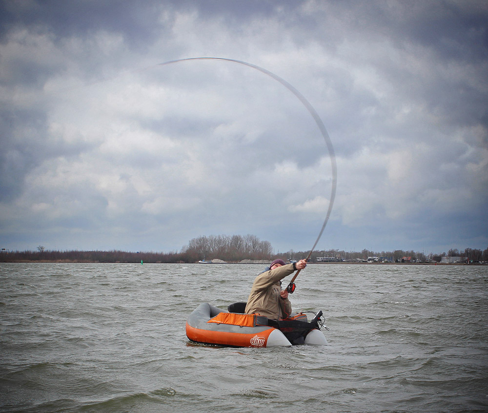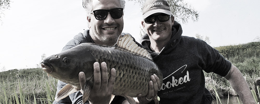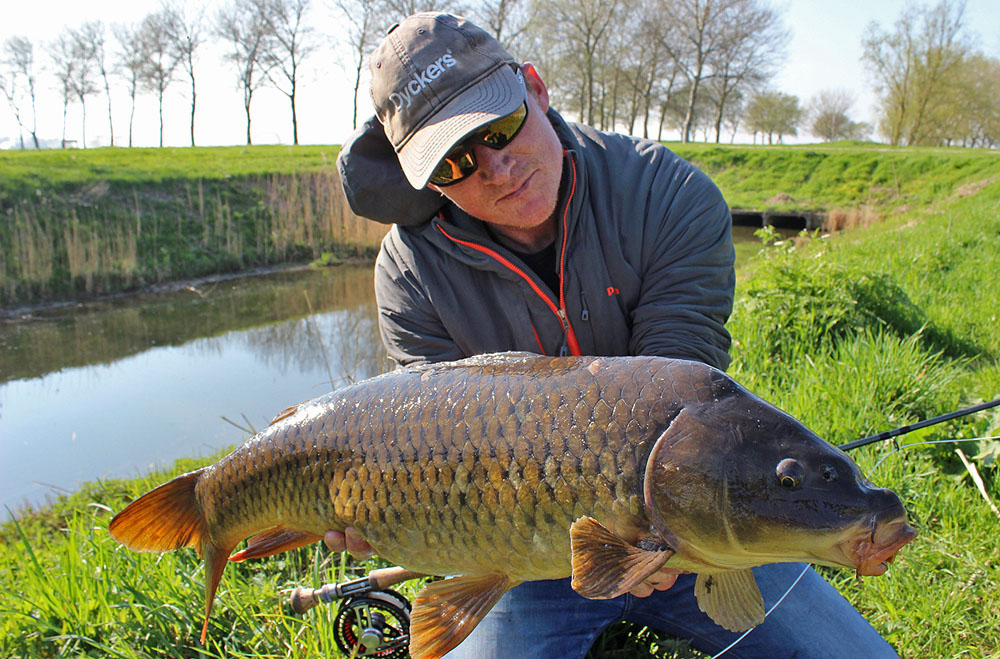 Ik knoop een hazeoor goudkop, haakje 14 aan het eind van mijn leader en werp drie meter voor de drukbezige meneer in. De stroming doet de rest en neemt de imitatie rustig over de bodem mee, hoppelend van steen naar steen. Alles kan gevolgd worden en het moment gaat naderen. Nog een meter, een halve meter, de spanning stijgt. Ongeduldig kijk ik of hij de goudkop pakt. Maar nee hoor, de imitatie hopt gewoon verder, 10 centimeter langs zijn neus en hij aast gewoon door alsof er niets aan de hand is. Nou ja zeg! Een tweede en een derde worp krijgen hetzelfde vervolg. Dan maar eens een vlokreeft imitatie proberen, groen van kleur. Weer werp ik in, ondertussen wat meters opgeschoven met de vis mee. Een meter, een halve meter, vol goede moed volg ik het groene gevalletje. De barbeel maakt een kleine beweging naar links, even is er een rukje aan de leader, een tikje en ze hangt. Staat vervolgens even stil, het lijkt erop alsof ze niet weet wat er gebeurt, nadenkt wat ze nu gaat doen, en dan, weg is ze. In een streep naar de overkant, daar waar de stroming harder is en een diepe geul heeft gemaakt. Wat een kracht heeft dat beest zeg, ik zie warempel de backing! Hevig vechtend is hij nu in de stroming bezig mijn vijf flink aan het kromtrekken. Hij schiet richting een in het water liggende tak, de slimme krachtpatser. Het is nu buigen of barsten. Ik loop langs de oever om nog enigszins controle te krijgen. Eindelijk krijg ik beweging en weet hem van de tak weg te houden. Heel langzaam komt de vis nu mijn kant op. Drillend op de reel, meter na meter terug pakkend. Het goud blinkt in de felle zon als ik hem in mijn handen aanschouw. Een dikke vijftiger, flinke baarddraden en in een puike conditie. Kortom een mooie vis, met ongekende kracht, de Barbus Barbus.