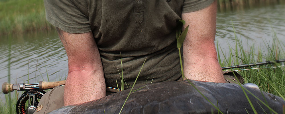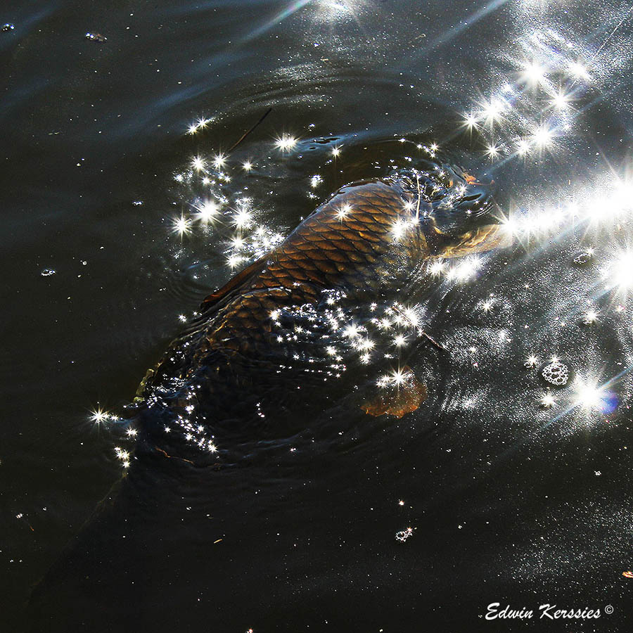 Het is tropisch warm in de eifel. Het zweet gutst me van het voorhoofd, als ik het landweggetje afdaal richting het verlaten weiland in een diep dal ergens aan de kyll. In de verte hoor ik de stroomversnelling, die zich bij de doorwaadbare plaats bevindt. Hier gaat het bos over in een groene vlakte. Aan de ene kant van de oever bevindt zich een steile helling bedekt met bomen en rotsen en aan mijn kant het weiland gelegen tussen de bossen. Een prachtig gezicht, waar de tijd even stil lijkt te staan. Twee buizerds cirkelen rondjes over de toppen van de flinke hoge steile wand. Struinend loop ik nu langs de kant op zoek naar azende vis. Links springt een alvertje en even verderop zitten enkele kopvoorns te rommelen aan de oever. Onder de overhangende takken aan de overkant aast een vis wat een forel lijkt zijn. Een flinke kolk een paar meter verderop krijgt mijn aandacht. Dit is geen normale kolk, het lijkt meer een staart of iets dergelijks. Het water is hier nog geen 30 centimeter diep en kraakhelder. Het stroomt erg traag. En dan zie ik de silhouet. Barbeel, kan niet missen! Hij is druk aan het wroeten in de bodem op zoek naar kreeftachtigen en insectenlarven.