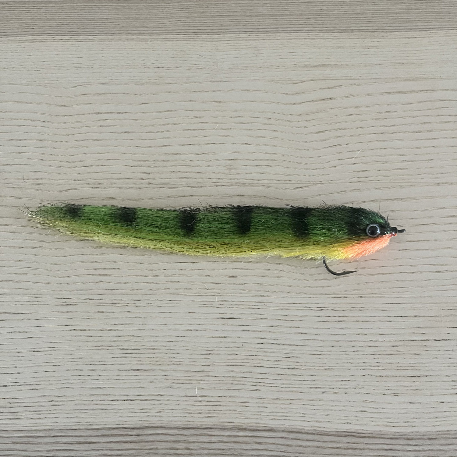 Dyckers Tiger – 22cm long made with Dyckers Fibers Yellow, Orange & Green on the Dyckers pike hook 6/0 with Dyckers eyes. One of the best flies for pike. Because of the strong hook also used for (big) saltwater species.