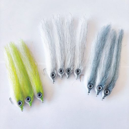 By far our favorite seabass flies the last 2 years including The Blue One, The Grey One and Dyckers Chartreuse 11. All flies around 11 a 13cm made with Dyckers Fibers on Gamakatsu hooks (sc15 2/0 and sl12s 2/0) Best Seabass packet you can get!