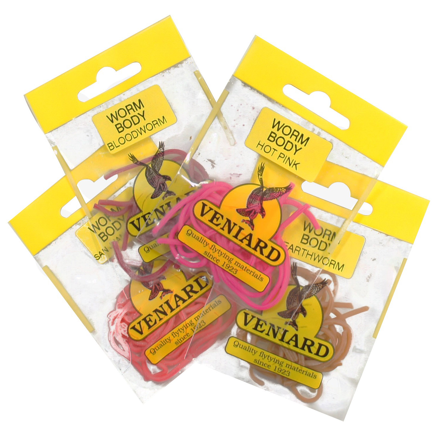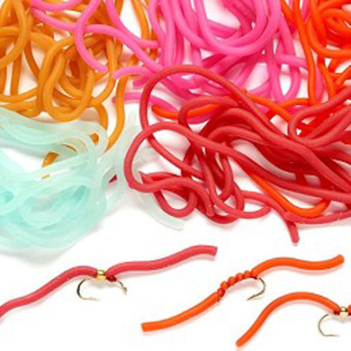 The next big thing in competition flies is the Squirmy Worm, and Squirmy Worm Body from Veniard is the ideal material for making these killer flies. (also good for carp, etc.) Available in 3 great colours, with ten x 14cm long pieces of highly stretchy 2mm soft rubber. Great for tying in for legs, or even winding on for a cracking body material.